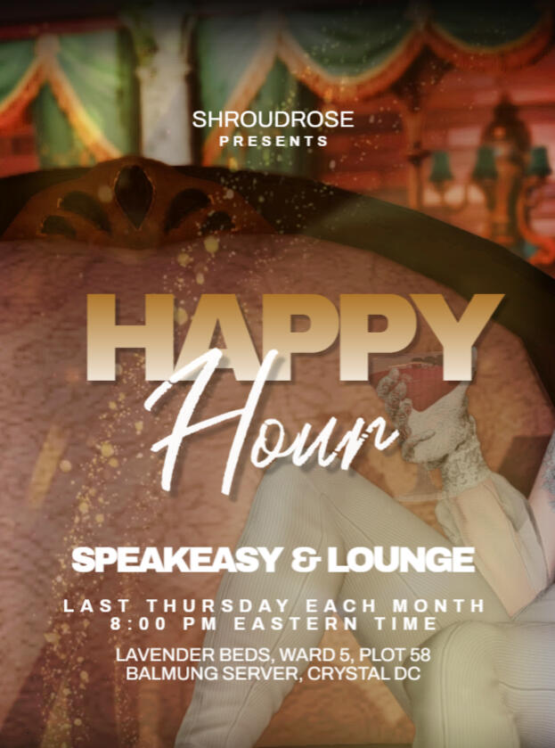 Visit Teatime's Shroudrose Speakeasy & Lounge at our monthly Happy Hour for an evening of drinks and good company. Shroudrose Speakeasy seeks to provide a bar environment that is both relaxed and refined, an upscale establishment where you can socialize or see to your own business affairs with discretion. If our imbibements don't strike your fancy, rumors are Shroudrose information brokering and private investigation services are available to those know the right way to ask. Join us on the last Thursday of each month at 8:00 PM eastern time at Lavender Beds, Ward 5, Plot 58 on the Balmung server in the speakeasy downstairs.