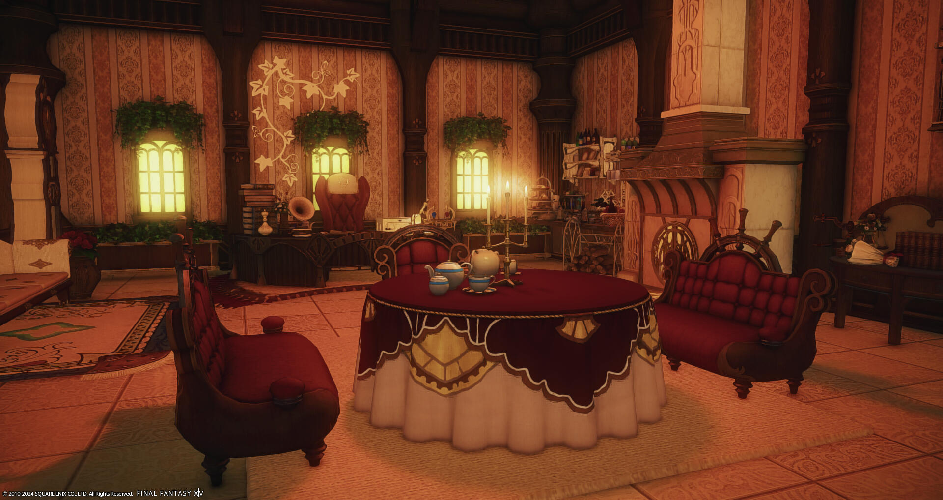 Within the Lavender Beds of the Twelveswood, with a cliffside at its back and a flowing stream beneath the small bridge that marks its entrance is nestled a large mansion with a finely manicured yard in the fifth ward Lavender Northeast subdivision. Once housing a rowdy free company of adventurers many summers ago, it now serves as the site of the Shroudrose Teahouse and Speakeasy, a teahouse and upscale bar and lounge serving everything from specialty tea blends, to a wide array of spirits and cocktails, to light meals and snacks both sweet and savory.Shroudrose Teahouse and Speakeasy is our free company estate, a large mansion in the Lavender Beds. The free company house is a public role-play space where anyone is welcome to come role-play at any time, and can be used as a venue for events with some prior discussion. To stop by when there is a crowd and the place is staffed by player characters, please see our Events section. If you wish to role-play in the teahouse outside of our event hours, you can assume NPC staff take care of your characters, or you can contact us and we will have a character come assist you if possible. Feel free to come take a look at our decor, and leave a message in the Guest Book, if you please!