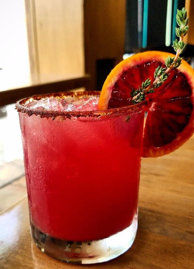 Bloody Fuller Rejoice in the glory of blood orange juice, gin, sun lemon juice, and a dash of nopales nectar, garnished with a blood orange slice and a sprig of thyme, with a rim of salt and paprika, blooming red with conviction.