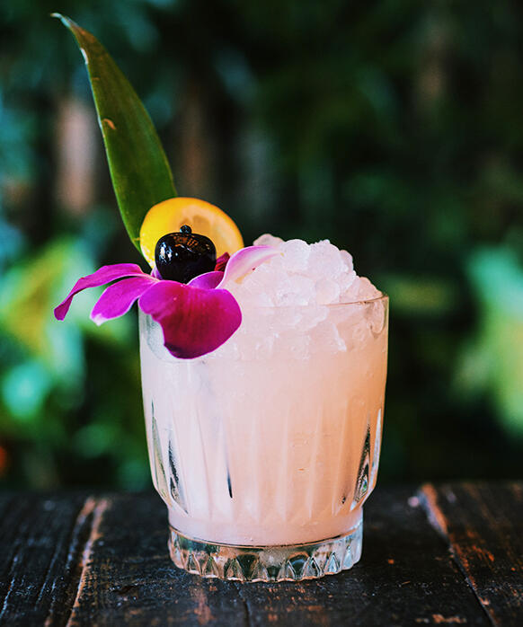 Lakshmi’s Bliss You’ll be charmed by this blissful, frozen blend of rye whiskey, prickly pineapple juice, fresh heavens lemon juice, orgeat dashes, and anise and mint bitters, garnished with a prickly pineapple leaf and heavens lemon wheel.