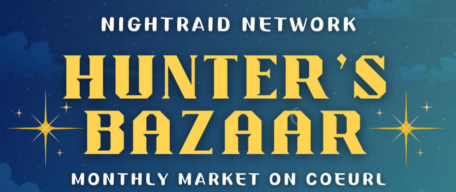 | Adventurers, travelers, and hunters monthly market RP. | Sunday, November 9th 9:00 PM - 12:00 AM EST. | Silver Bazaar[x16,y29], Western Thanalan, Thanalan, Coeurl, Crystal DC. |